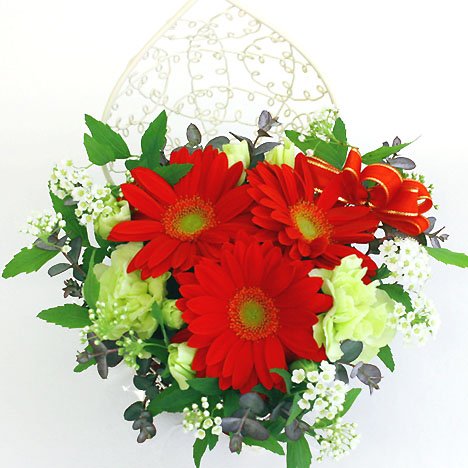 - [花材] 赤系ガーベラ、スプレーカーネーション、グリーン等