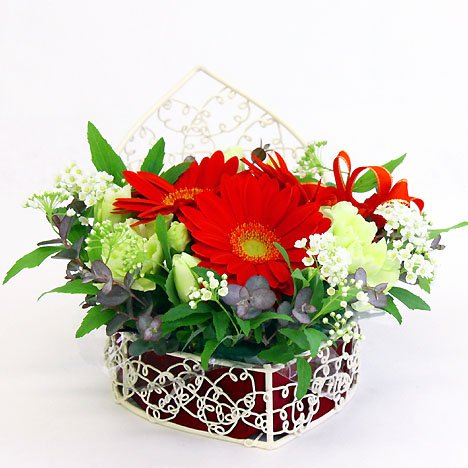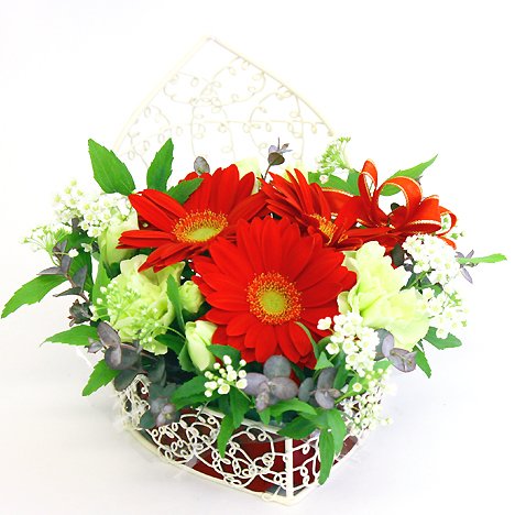 人気のハートのワイヤー器に赤系のガーベラを使用したアレンジメント。
