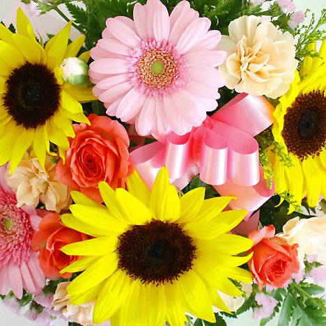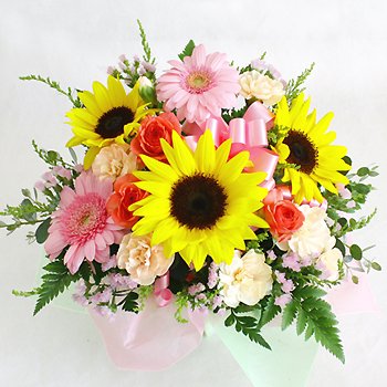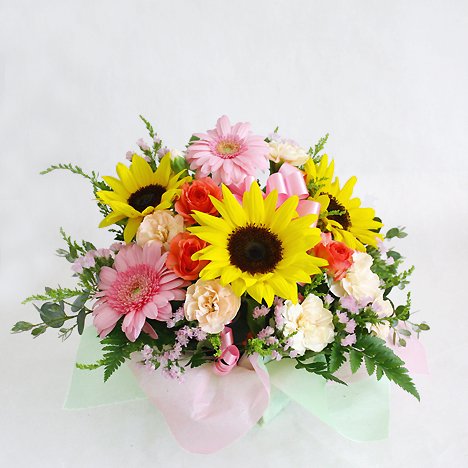 - 【花材】 ヒマワリ、ガーベラ、スプレーカーネーション、スプレーバラ、グリーン等