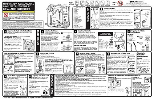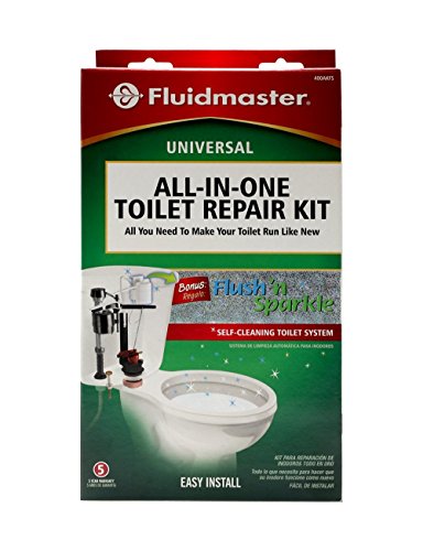 5 year warranty. Give the toilet tank a complete overhaul with the Fluidmaster complete toilet repair kit. The complete toilet repair kit includes the #1 fill valve in the world, the 400A, a 2-inch flush valve with a flapper, a new tank lever, and tank-to-bowl hardware and gaskets. It's everything you need to get a toilet working like new again, all in one box. Bonus: the 400AKFS also includes a Flush 'N Sparkle bleach kit, so you can clean the toilet with every flush without damaging tank parts.