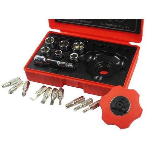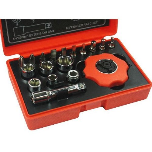 ハンドラチェットと良く使うビットを18pcsセットにしました。 ハンドラチェット&ビットセット(クイックラチェット・グリップラチェット)は仮締め付け時やボルト空回り時の早回し作業に役立ちます。 狭い場所でも使いやすい山形ラチェットタイプです。 グリップ直径:Φ48mm厚さ:18mm(差込部除く)ギア数:72山(最小送り角度5°) 収納に便利なケース付き!! <仕様> ・ハンドラチェット:差込角6.3mm(1/4) ・プラスビット:♯1・♯2・♯3 ・マイナスビット:3・4・5・6mm ・ヘックスビット:3・4・5mm ・ビットソケット ・6角ソケット:6・8・9・10・12mm ・エクステンション:全長50mm ・製造国:台湾 ・PL保険加入商品 ●差込角6.3mm(1/4)●6角ソケット ※商品改良の為、仕様・外観は予告なく変更する場合があります。