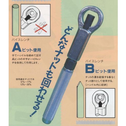 「錆びたり、なめたりしたボルト・ナットがとれない(T_T)」そんな時威力発揮!! A・B、種類のビットによる強引なまでの機能!まずはAビットによるギザギザヘッドのバイス(万力)による締め付け回し、それでだめならハンドル内収納のくさび形Bビットによりナットを割り取ります。 ナットを壊さずにまわせるAビットの機能があるのは当社のバイスレンチだけです。一度つかったら手放せません。バイク修理や自動車のオイル交換時等によく使用します。その他Aビットによりパイプ丸棒を挟んでまわしたりいろいろな使い方ができます。 仕様 適合ナット寸法:9~17mm