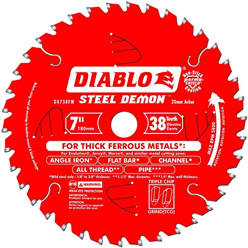 Freud's Limited Lifetime Guarantee. The Diablo Steel Demon 7in. 38 Tooth Circular Saw Blade is a high-performance blade designed to cut thick ferrous metals mild steel only, including steel studs, angle iron, flat bar, channel, EMT conduit, all-thread rod and pipe. Features a super-thin laser cut kerf, Perma-Shield nonstick coating, laser-cut stabilizer vents, tri-metal shock-resistant brazing and more. Blade Diameter in. 7, Tooth Grind TCG, Teeth qty. 38, Blades qty. 1, Tip Type Carbide, Engineered Venting Yes, Arbor Size in. 20mm, Blade Speed RPM 5,800, Blade Use Ferrous metal, Arbor Knockout Yes, Corrosion Resistant Yes. Super-thin laser cut kerf for effortless cutting performance Tico hi-density carbide provides a controlled carbide wear that stays sharper longer Perma-Shield nonstick coating shields the blade against heat, gumming and corrosion Laser-cut stabilizer vents trap noise and vibration and stabilizes the blade Tri-metal shock-resistant brazing allows carbide tips to withstand extreme impact Laser-cut heat expansion slots allow blade to expand due to heat build-up, keeping the cut true and straight