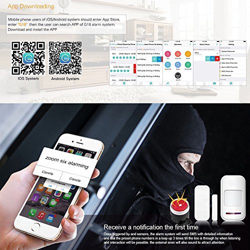 This alarm system is a high-end GSM alarm with stable and reliable performance and applies 1.7-inch TFT color screen and touch keyboard with built-in powerful CPU master and excellent operation experience. Automatic voice prompt or SMS message notify the location and events upon alarm.Mobile App IOS/Android Remote Control and Scheduled arm disarm make alarm more smart.Easy self install and do it yourself add more alarm accessoires.