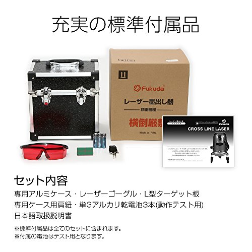 - 付属品:専用プラスチックケース、レーザーゴーグル、L型ターゲット板、専用ケース用肩紐、単3アルカリ3本(テスト用)、取扱説明書