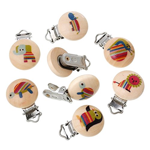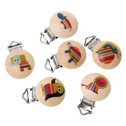 funnytoday365 5点ロットミックスベビーおしゃぶりクリップAnimal Printedナチュラルカラー木製メタルホルダー29 x 44 mm