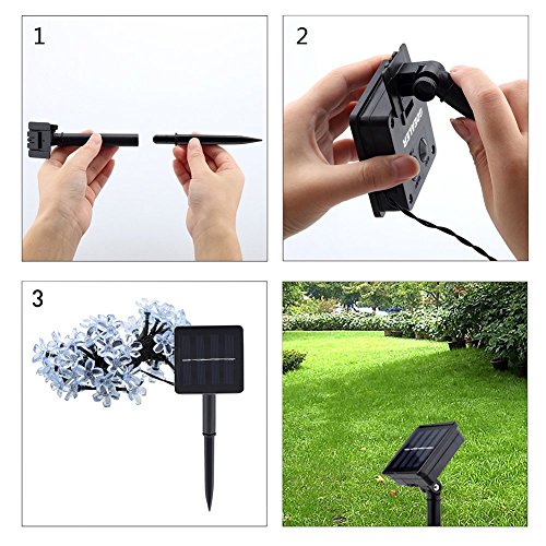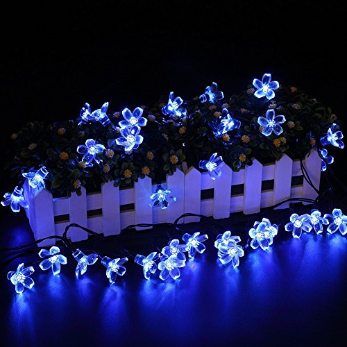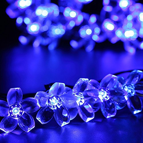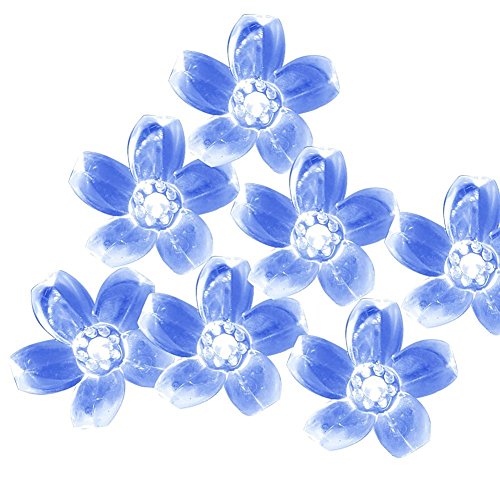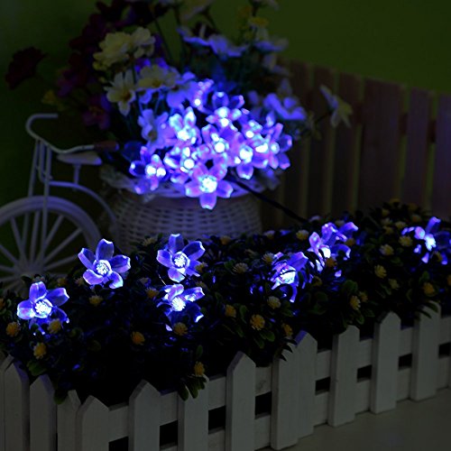 Color:blue Features: * Environment-friendly products, high energy conversion rate. * Put under sunshine during the day, and it begins to light up at night. * It varies with the intensity of sunlight, user's geography locations, weather conditions and shift of seasons. * Put on wall, window, door, floor, ceiling, grass, Christmas tree, post or building,adds perfect atmosphere to your place. * A perfect decoration for Valentine's Day, Christmas, Party, Wedding, etc. * Solar powered panel is stood by a 20cm garden spike. * With ON/OFF,MODE switch. Specifications: Charging time: 12 hours Main Cable Length: 6.8m Approx. 10cm from one ball light to the next one Battery: 1.2V 1200MA Solar panel: 2V 300MA Number of LEDs: 50 Light Color: White/Warm White/Multi Color/Blue Bulb Life: Up to 5000 Hours Note: 1.If the ground is too hard, do not twist or hammer it with force. Try to soften the ground with water and then insert into the ground. Failure to follow this may result in product damage 2.It is suggested the solar panel to be fully charged for 6h at the first use 3.The light will light up automatically at dusk and may turn off automatically when ambient light is too strong(above 15lux) 4.Turn the light on and set light mode before charging the solar power, so it will light up at dusk Package Includes: 1 * 22ft/50 LED String Flower Lights with solar panel 1 * Stand 1 * Spike