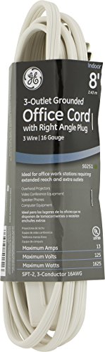 Extend the reach of your office and small home electronics with the eight-foot Grounded Office Cord with Right Angle Plug from GE. Equipped with three grounded outlets, the extension cord is perfect when you're in need of a few extra outlets and its low-profile, right angle plug keeps it close to the wall and out of the way. The GE Grounded Office Cord with Right Angle Plug is ideal for overhead projectors, video conferencing equipment, speaker phones, computer equipment and more, intended for indoor use and should be fully extended before using. This product is UL listed and backed by a 90-day limited warranty.