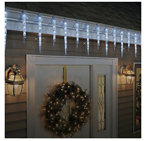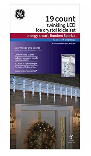 Lighted Length: 9 ft / 2.7m, Strand Spacing: 6 inch / 15.2 cm, Lead wire: 24", Weight: 3.23 lbs / 1.47kg. This holiday season decorate your home with our brilliant GE 19 CT Twinkling LED Ice Crystal Icicle set. The set features 96 Energy Smart Random Sparkle LED lights within 19 Crystal Ice Style Icicles of varying length. Also included in this set are mounting clips for easy installation for both indoor and outdoor use.