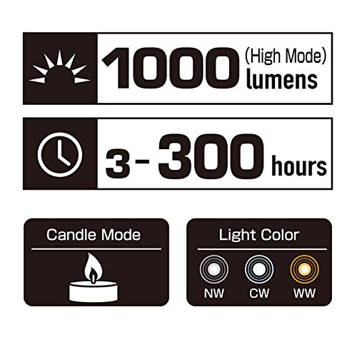 ●チップタイプ白色LEDx18灯+チップタイプ暖色LED×18灯●最大ルーメン:約1000ルーメン(白色モード最大時)●ディマーコントロール●スローライティングスイッチ●インスタントオフスイッチ●耐塵・2m防水仕様(IP68準拠)●充電・給電可能●10m落下耐久●使用電池:専用リチウムポリマー充電池3.7V5,000mAhまたは単1形アルカリ電池●オペレーション:白色>昼白色>暖色>キャンドル●実用点灯:3~200h(白色)>6~250h(昼白色)>7.5~300h(暖色)>150h(キャンドル)●本体サイズ(mm):φ102.2×189●本体質量:約680g(電池含む)●付属品:ハンガーフック、50cmMicroUSBケーブル