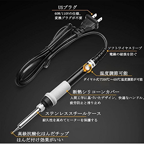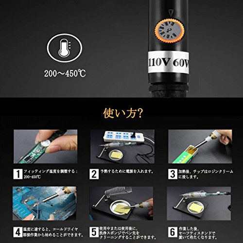 この110V/60Wのはんだごてはいろんな作業に適用します。先進な内部加熱セラミックスインダクタ技術で加熱時間をほんの少ししか抑え、ダイヤル式の温度調節機能が付き(200℃-450℃範囲内で調節でき)、すぐにお使いいただけます。また、5個のコテ先付き、異なる作業に対応できます。プリント基板、電子工作、オーディオ、AV機器、ラジコン等の修理や作りにご活用いただけます。