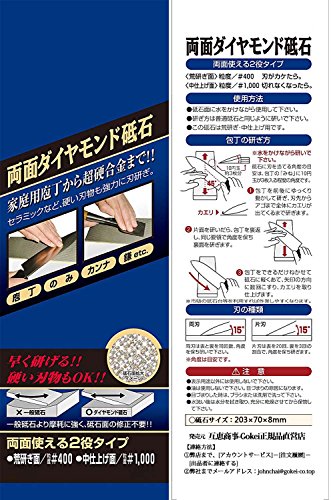 - 【両面使える2役タイプ】 荒研ぎ面400:刃がカケたら。 中仕上げ面1000:切れなくなったら。セラミックなど、硬い刃物も強力に刃研ぎ可能。