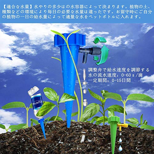 - 上部のつまみで給水速度を0~60S/滴調整できます、給水日数:1~15日。植物の種類、土などにより毎日の必要な水量は違いです。適量な水をペットボトルに入れてください。