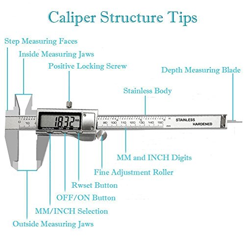 - 多機能で使いやすい - バーニアキャリパーを使用して、内部、外部、深さ、および刻み目の寸法を正確に測定できます。 この電子マイクロメーターキャリパーに3つのボタンがあります.1つはオン/オフ、1つはmm / inchスイッチ、最後はゼロに戻ります。 計量キャリパーをどこにでもスライドさせ、ゼロボタンでゼロにリセットすることができます。読み取り値は、インチまたはミリメートル形式で表示できます。任意の位置でのゼロ設定
