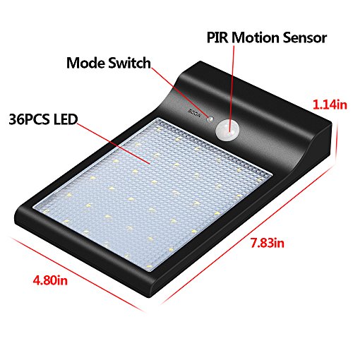 - 3.高輝度&センサーライト:36LEDライトが付き、highモードに450ルーメンの出力を達します。非常に明るくて、防犯対策に最適です。明暗センサー&人感センサーが搭載して、夜になると、ライトは自動点灯しています。人感センサーモードを設置すると、人の動きを感知して、強く光っています。