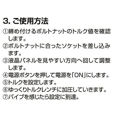 ●バイブと音で知らせるデジタルトルクレンチ。●ソケットの取り外しに便利な、クイックリリース機構。●液晶が180°回転して作業楽々。●設定したトルクでボルトナットを締め付ける為のプリセット型トルクレンチ。●デジタル表示の為、簡単に設定が可能。●設定したトルク値に達したらバイブレーションでお知らせ。●左回し、右回し、両方向で使用可能。●オートOFF機能で電源の消し忘れ防止。●品番:DTW-127●用途:一般家庭、DIY用●差込角:12.7mm 設定範囲:27~210N・m 最小表示単位:0.1N・m●製品精度/右回:±4.0%、左回:±4.0% 使用環境温度範囲:-5~40℃●オートOFF時間:約2分 全長:約435mm 重量:約1070g●使用電池:単四電池×2本(別売) 別途お買い求めください●クイックリリース機構・液晶180°回転●保管について:直射日光のあたる場所、湿気の多い場所は避けてください。付属の専用ケースに収納してください。長期間使用しない時は、電池を抜いてください。●注意:本製品は一般家庭用、DIY用です。業務用、精密作業などに使...