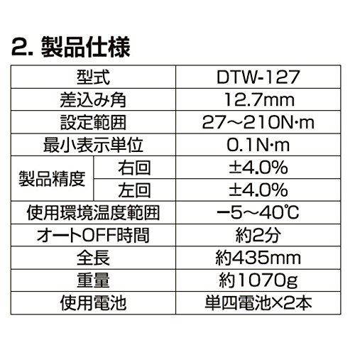 - 差込角:12.7mm 設定範囲:27~210N・m 最小表示単位:0.1N・m