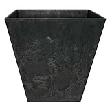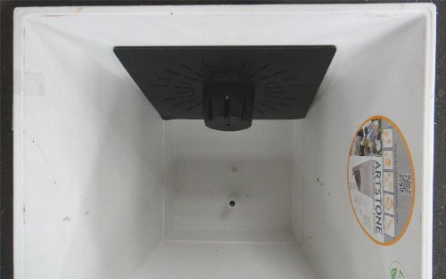 今、ヨーロッパで人気のニューアイテムです。樹脂に天然石の粉末を混ぜ、成形する事で、ナチュラル感と質感を持たせました。中底に小さな穴を多数空けることにより底面給水を可能にし、また底部の特殊構造により底栓を抜く事で、水位を自動調整してくれる、画期的な構造です。屋外では底栓を抜いてお使いください。
