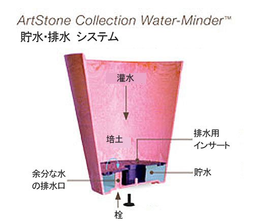 今、ヨーロッパで人気のニューアイテムです。樹脂に天然石の粉末を混ぜ、成形する事で、ナチュラル感と質感を持たせました。中底に小さな穴を多数空けることにより底面給水を可能にし、また底部の特殊構造により底栓を抜く事で、水位を自動調整してくれる、画期的な構造です。屋外では底栓を抜いてお使いください。