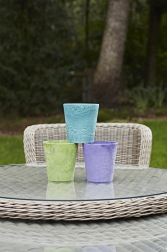 今、ヨーロッパで人気のニューアイテムです。樹脂に天然石の粉末を混ぜ、成形する事で、ナチュラル感と質感を持たせました。中底に小さな穴を多数空けることにより底面給水を可能にし、また底部の特殊構造により底栓を抜く事で、水位を自動調整してくれる、画期的な構造です。屋外では底栓を抜いてお使いください。