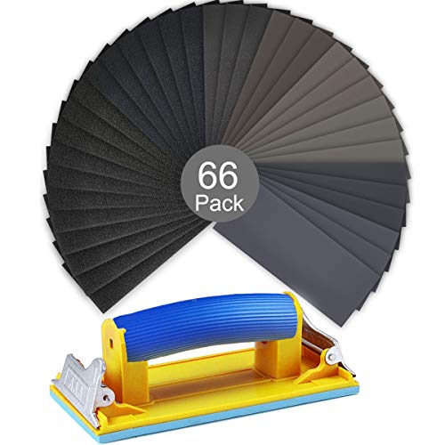 サンドペーパー 紙やすりセット 66枚入り GUNA ハンドサンダー付き 耐水ペーパー ヤスリホルダー (120 240 400 600 800 1000 1200 1500 2000 2500 3000×各6枚)耐水ヤスリ 研磨紙