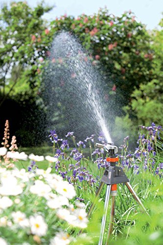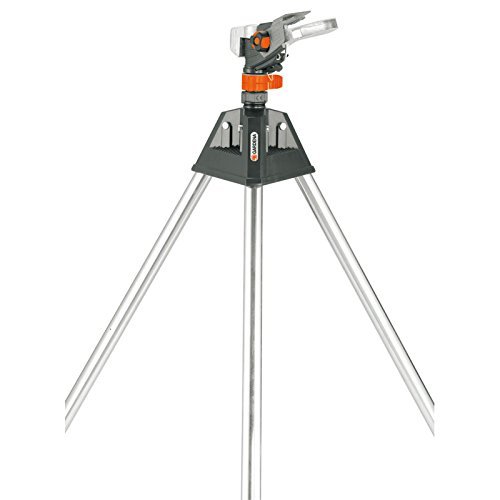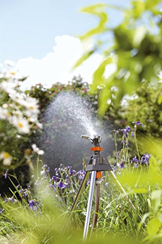 - Gardena pulsating sprinkler on tripod works for even, steady watering of taller plants