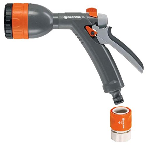 1-year warranty. From a spritz to a full-on soaking, the GARDENA Classic Multi Function Hose Gun is the perfect choice for thirsty gardens. This simple hose gun features a rugged plastic body and simple attachment system that fits most standard garden hoses. Give your plants, flowers, and bushes their choice of hard jet, flat jet, soft spray or full spray. About GARDENA With 50 years of bringing innovative gardening tools to market, GARDENA has become a household name throughout Germany. Based in Ulm, Germany, GARDENA approaches the garden as an extension of their customers' living spaces. GARDENA designs tools and accessories that are practical, visually appealing, and easy to use, making it a breeze to enhance those outdoor living spaces. Today, GARDENA operates as a subsidiary in the Husqvarna Group, the world's largest producer of outdoor products. Made of long-lasting metal and plastic. Hard jet, flat jet, soft spray, and full spray patterns. Soft grip for effective use. Includes waterstop function for added comfort. Dimensions: 11L X 1.5W X 13H in..