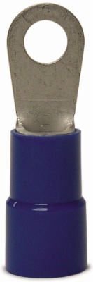 3/8-Inch stud size. 4 pack, 3/4", blue, 6 AWG, ring terminal, vinyl insulated barrel, rated at 600V maximum, temperature rating: 167 degree Fahrenheit/75 degree Celsius, Carded.