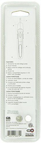 Makes quick work out of any electrical project Screwdriver tip and voltage probe 360? bright visual indicator New simple touch design eliminates need for connecting test lead Tests outlets, fuses, switches, extension cords, and light fixtures 12-250 VAC/DC on live circuits or continuity on non-live circuits 50-60 Hz Length: 1.5Width: 5.7Height: 2.7