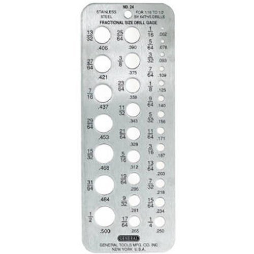 The Hobby Drill Gage is a useful guide for identifying drill bit sizes and measures bits from 1/16 inch to 1/2 inch x 64ths. Etched graduations are filled in black to give high contrast and will not wear off this drill gauge. Gage measures 2-3/8 inch x 6-3/4 inch overall. This drill gage is made from stainless steel to prevent rust. General Tools Hobby Drill Gage is extremely helpful when working with older, unmarked drill bits, as well as with bits that are too small to fit diameter markings. The Hobby Drill Gage is a useful guide for identifying drill bit sizes and measures bits from 1/16 inch to 1/2 inch x 64ths. Etched graduations are filled in black to give high contrast and will not wear off this drill gauge. Gage measures 2-3/8 inch x 6-3/4 inch overall. This drill gage is made from stainless steel to prevent rust .