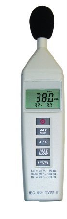 Meets IEC651, ANSI S1.4 type2 standards. Low battery indicator. Large 4 digit LCD display. Meets IEC651, ANSI S1.4 type2 standards. Range: 32 to 130 dB in 3 ranges. Frequency range: 31.5 Hz to 8kHz. Accuracy: +/-1.5 db. Resolution: 0.1 db. Response time: 0.5 sec. Sensor: Electrets condenser microphone.