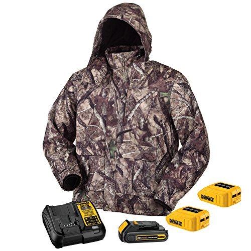 Included with a FREE additonal DeWALT DCB090 12-Volt/20-Volt MAX USB Power Source for charging up to USB compatible devices the DeWALT DCHJ062 20-Volt 1.5 Ah True Timber HTC Camo Heated Jacket Kit comes included with (1) DCB201 20-Volt Premium 20-Volt MAX Lithium-ion 1.5 Ah Battery, Charger, and DCB091 USB Power Source. The battery pockets are made to expand to accept DeWALT XR 4.0 Ah batteries, and the soft water and wind resistant polyester shell allows for improved comfort during harsh weather. Up to 5.5 hours of run-time on low setting using 20-volt compact 1.5 Ah battery. The HTC camo jacket by DeWALT has a removable hood with neck and face guard. The jacket features 7 total pockets incluing left and right waist, left and right stomach, left outer chest.