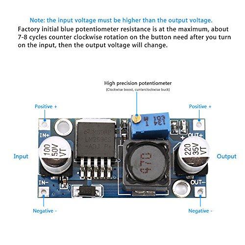 •安定した出力を保証するために、降圧モジュールであるため、バルクヒートシンク(上記の10W出力)を追加しながら、2.5A未満での使用には現在の長時間の使用を推奨します。設定は最小1.5Vの差動