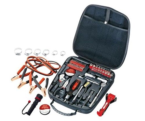 両面EVAケースに入れられています。内容は以下の通りです。タイヤゲージ、ナイロンストリング、電気テープ、電圧テスター、プラスチック懐中電灯, 7 ftです。ブースターケーブル、ラチェット式ビットドライバー、3番、5番、7ではありません。真鍮ワイヤーブラシ, 6 In。ラジオペンチ、3 / 8 x 1 / 4インチADAPTOR , 6 In。