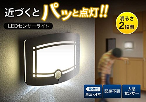 LEDセンサーライトです。暗くなり人感センサーが感知すると約30秒自動点灯、その後自動消灯します。自動で点灯・消灯するので、電気の消し忘れがなく省エネです。使用用途によって、強・弱の2段階の明るさが選べます。停電時や緊急時にも役立ちます。