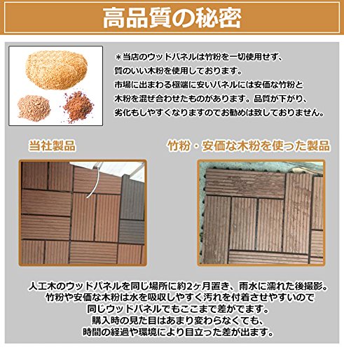 ・ 商品サイズ:1枚(約)幅300×奥行300×高さ21mm ・ 商品材質:(表面)人工木材(裏面)ポリエチレン ・ 商品重量:1枚(約)1.0kg ・ 原産国:中 国 ・ 北海道・沖縄・離島については追加送料がかかりますのでご了承ください。27枚ごとに800円ご請求させていただいています。 注意事項: ・ 組み立てる際は軍手をはめて作業を行ってください。・ 経年変化に関するものは保証対象外です。 ・ PC画面によりパネルの色の見え方が若干異なる場合がございます。 ・ レビューにご投稿頂きました内容・画像は、商品紹介の用途に使用させて頂く場合がございますのでご理解とご協力をお願い申し上げます。