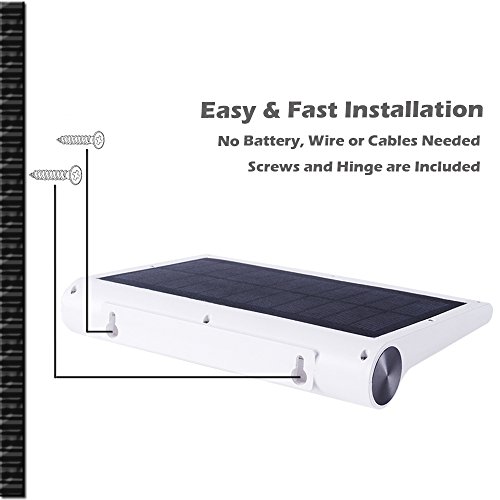 - 取り付けが簡単:パッケージにはネジが入っており、バッテリー、ワイヤーまたはケーブルは必要がありません。照明と直射日光が必要な場所に設置するだけです。(最初の使用は太陽の下で6時間充電される必要があります)、それからは望みの領域を完璧に照らすことができます。