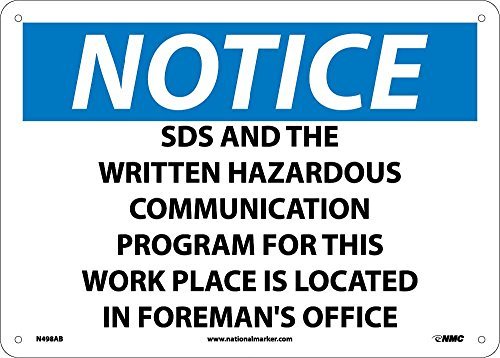 National Marker Corp. N498AB Notice SDS And The Written Hazardous Communication Program For This Work Place Is Located In Foreman's Office Sign 10 Inch X 14 Inch 0.040 Alum