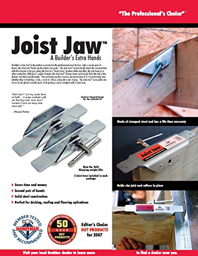 The Grabber joist jaw is the perfect accessory for the professional wood framer. Like a second pair of hands, the joist jaw holds up the rafters and joists, eliminating the need for 2 people. The joist jaw automatically levels the crossmember with the rimjoist or ledger giving the framer a hands free position while installing the joist hanger or other connectors. With just a couple of twists, the joist jaw clamps down on its target from the top or the bottom and holds your lumber tight. This tool increases the accuracy and production of a 2-man framing crew whether they're building a deck, a roof, or a floor, saving time and money. The joist jaw is reusable and made of zinc-plated durable steel. Package comes complete with 2 joist jaws per package. No. GJJ2: Material: Zinc Plated Steel ---- 1. 海外直輸入品となりますので、新品であっても、パッケージに多少のダメージがある場合もございますが、商品本体には問題ございませんのでご安心ください。2. 日本国内でのメーカーによる製品保証等は適用されません。3. パッケージや、説明書等は、英語表記となります。