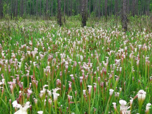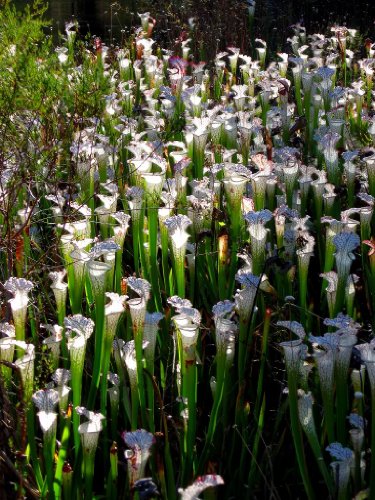 葉が筒状になった食虫植物でそれを虫を捕らえる落とし穴として使う、湿地に生える多年草である。袋の内側は粉を吹いたようになってすべすべになっている。また、内側の下方では下向きの毛がはえていて、虫を下へと落とすようになっている。袋の中には液体がたまっており、昆虫がこれに落ちると溺れて死に、分解吸収される。特に温暖な地域を除いて、葉は冬には枯れ、茎のみが越冬する。S.leucophyllaはアメリカのフロリダ州パンハンドル地方を中心にアラバマ州、ジョージア州およびミシシッピー州の南東端にも分布。高くほっそりと伸びる種類で、捕虫葉は最高1m以上に達するものもある大型種。捕虫葉の色は地は緑色で上部には白の斑点が加わり、ピンクから赤色の脈が強く混じるものもあって非常にカラフルである。蓋は良く発達し、その端は非常にウェーブしてフリルが付いた感じになっており、色とりどりで派手な感じがある。基本的には緑の地に白色が浮き出る白系タイプと赤色が強い赤系タイプの2つに分けることができる。