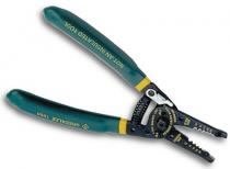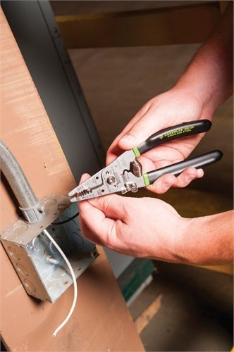 Lock tab protects cutting edges during storage. Features: Strips the outer jacket off both solid and stranded wire. Machined stripping stations with a positive stop provide precise stripping diameters. Ergonomically designed, extra-long cushioned handles add superior comfort and reduce hand fatigue. Long curved cutter blades reduce force required by 25% and can cut NM in a single cut. Lock tab protects cutting edges during storage. Pliers nose for working with small nuts and pulling wire. Hole in jaws for looping wires. Opening stop prevents spring from disengaging. Easy-to-read graphics. Cuts screws. Specifications: Capacity: Strips 10-18 AWG solid, 12-20 AWG stranded, Cuts #6-32 and #8-32 screws Length: 7-1/4" (184 mm)