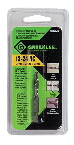 Product Description Greenlee Combination Drill/Tap Bit 1224 NC Use on mild steel, aluminum, copper, and brass. Back taper prevents thread damage from overdrilling. Made of highspeed steel with splitpoint drill tip. From the Manufacturer Complete hole drilling, tapping and deburring/countersinking in one operation with power drill saves labor and time. Back tapered beyond tap to prevent thread damage from over-drilling. Deburr/countersink also provided on bit beyond back taper. Made from hardened high-speed steel vs. carbon steel for longer life. High quality hex shank to ensure strong connection to drill chuck. Designed to tap up to 10-gauge metal.