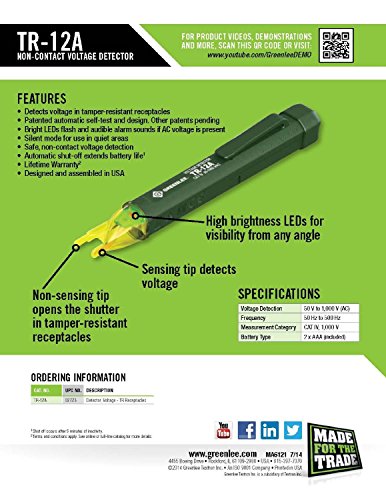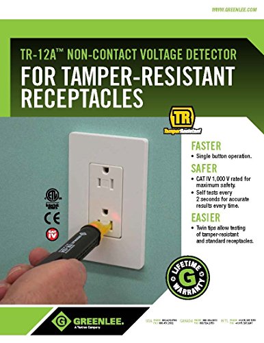 Greenlee's TR-12A is the first non-contact voltage detector designed specifically to test tamper-resistant receptacles. A second, non-sensing blade allows the TR-12A to open the protective shutters on these receptacles and test them for AC voltage presence. It can also be used to test conventional 120 volt receptacles. The TR-12A provides users with reliable voltage detection every time. Detect voltage; detect from 50V to 1,000V (AC) safely and easily, just press the button. A self-timer shuts the unit off after 5 minutes of inactivity to extend battery life. Self-test; TR-12A employs the same innovative self- test that was introduced on the GT-12 and later on the GT-12A. It uses a simulated AC voltage to test its antenna, microprocessor, LEDs, and batteries every two seconds, so you can be sure that your results are always reliable. Lifetime warranty; all Greenlee test and measurement tools come with a lifetime warranty so you can get the most out of your equipment. Features; detects AC voltage in tamper resistant and conventional 15A and 20A, 120V receptacles. Patented automatic self-test. Bright LEDs flash and audible alarm sounds of AC voltage is present. Features silent mode for use in quiet areas. Safe, non-contact AC voltage detection. Automatic shut-off extends battery life. Lifetime warranty and designed and assembled in USA.