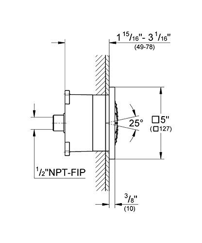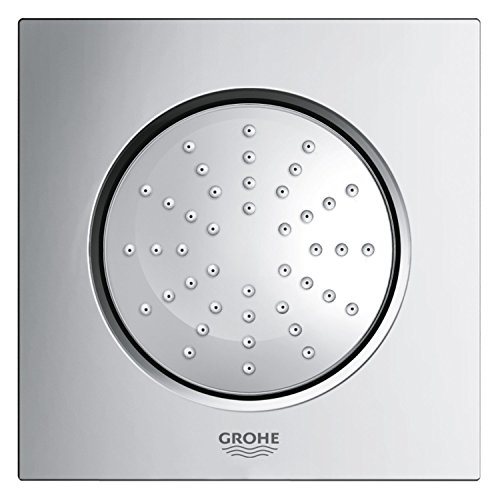 1/2 in. NPT Female threads. Creating a stylish, customized shower has never been simpler, thanks to the Rainshower F-series 5-in. body spray. A square design with an extremely low profile, it measures 5 in. x 5 in. and extends a mere 3/8 in. in depth. The result is seamless integration into shower walls and ceilings. The body spray is enhanced with GROHE DreamSpray features advanced shower engines to deliver precise and consistent water distribution throughout any spray pattern for an unparalleled and custom showering experience technology, which ensures even water distribution to each spray nozzle. GROHE FlowBalance regulates water flow and spray performance for perfect showering in multiple-shower installations, and GROHE SpeedClean protects the spray nozzles against limescale buildup. The Rainshower F-series 5-in. body spray has a 2.5-gpm flow rate, is adjustable and comes in GROHE StarLight finish for scratch and tarnish-resistant surfaces for a lifetime of beauty chrome, a lustrous finish that will not scratch or tarnish.