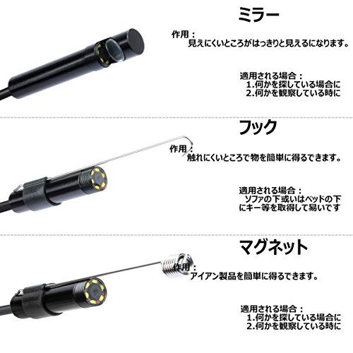 - パッケージ内容:本体*1、フォーカスパーツ*3、充電用USBケーブル*1、5m内視鏡*1、吸盤*1、英語取扱説明書*1、1年間の品質保証*1