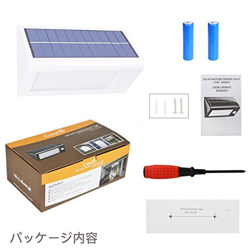 - パッケージ内容:ソーラー式ライト×1、ネジ × 2、膨張ボルト × 2、ねじ回し×1、取扱説明書(中英) ×1、充電可能リチウム電池(内蔵)× 2、穴あけ位置図 ×1、保証期間:1年間、アフターサービス