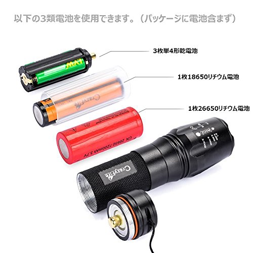 - IP65級防水、ズーム機能付き、200メートル以上の照射距離、3種類の電池対応