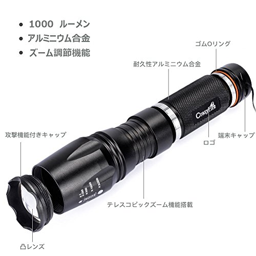 CrazyFire ハンディライト 調光可能 LED懐中電灯 3モード ズーム調整機能付き 500lm 防水 防災 登山 アウトドア 自転車用 キャンプ用 (レッド)