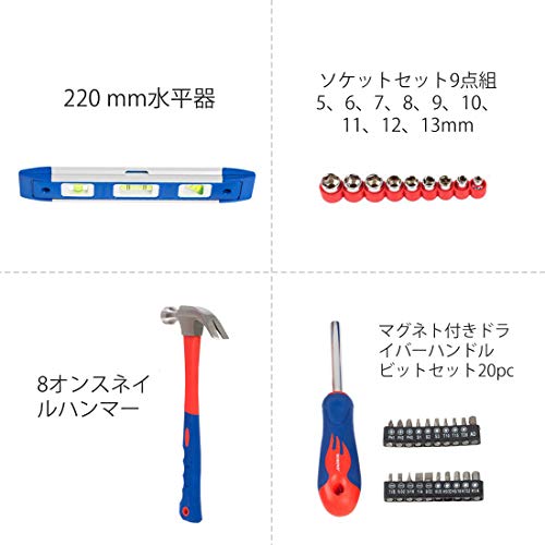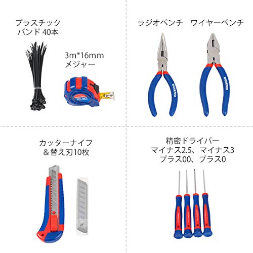 - セット内容:ラシオペンチ、精密ドライバー(2.5mm, 3.0mm, PH0, PH00)、 カッター、替え刃、差込角6.35mm(1/4インチ)の多機能ドライバーハンドル、差込角6.35mm (1/4インチ)のソケットセット(5、6、7、8、9、10、11、12、13mm)、ビットセット、ニッパープライヤー、爪ハンマー、内六角レンチ(1.5、2、2.5、3、4、5、5.5、6mm)、レベル、ビットセット、モンキーレンチ、プラスチックバンド。