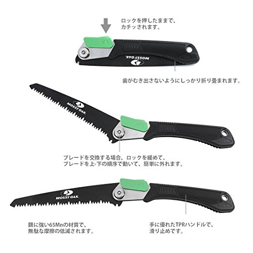 MOSSY OAK 替え刃式折込鋸 折り畳み式 刃渡り190mm 万能目 木工用 硬質プラスチック用替え刃 鉄工用替刃付き【専用収納ケース付き】